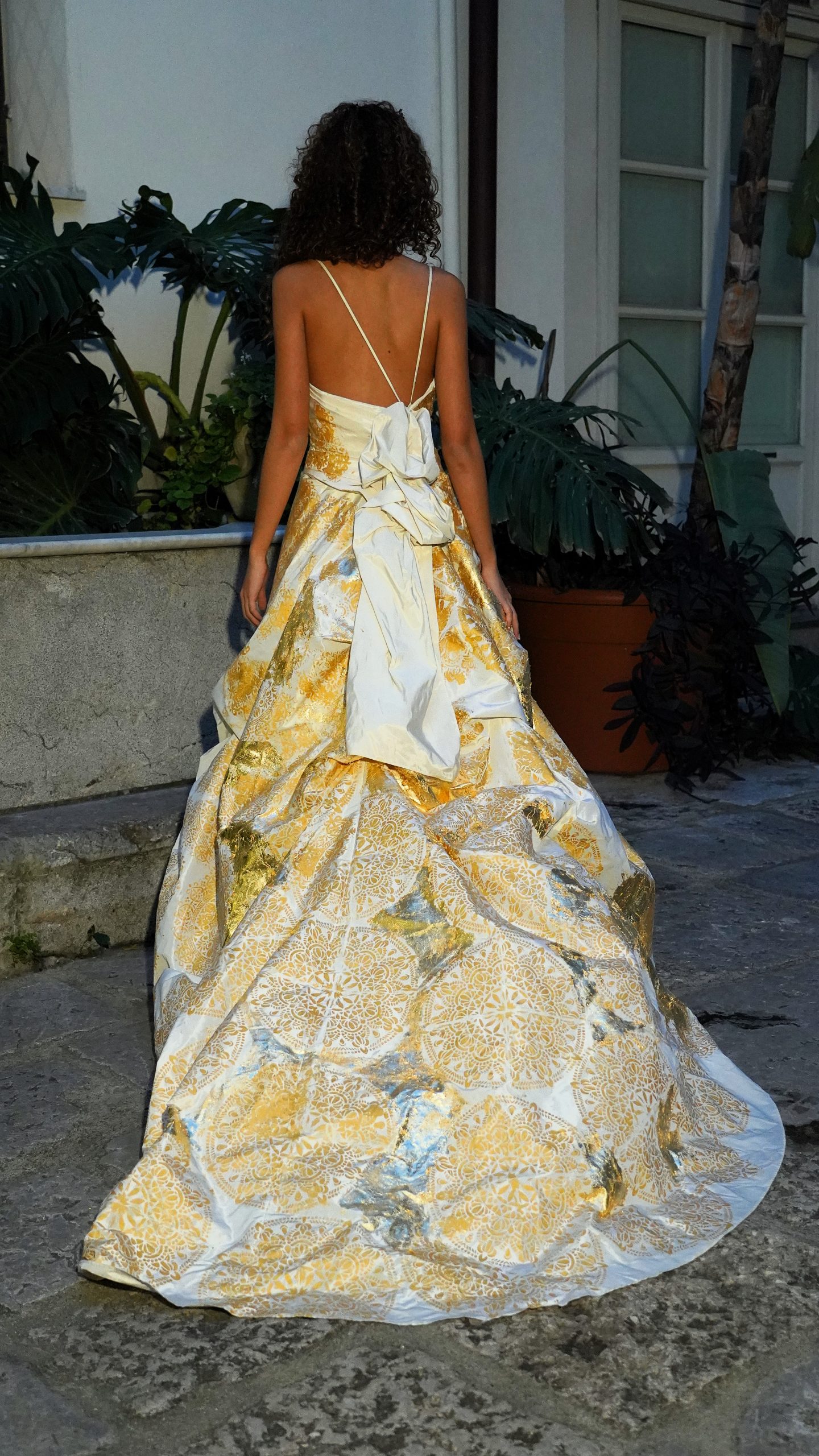 abito taffetà con bretelline e profonda scollatura e con dettaglio ricamato decorato da Domenico Pellegrino