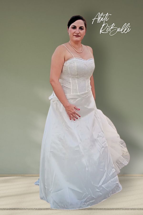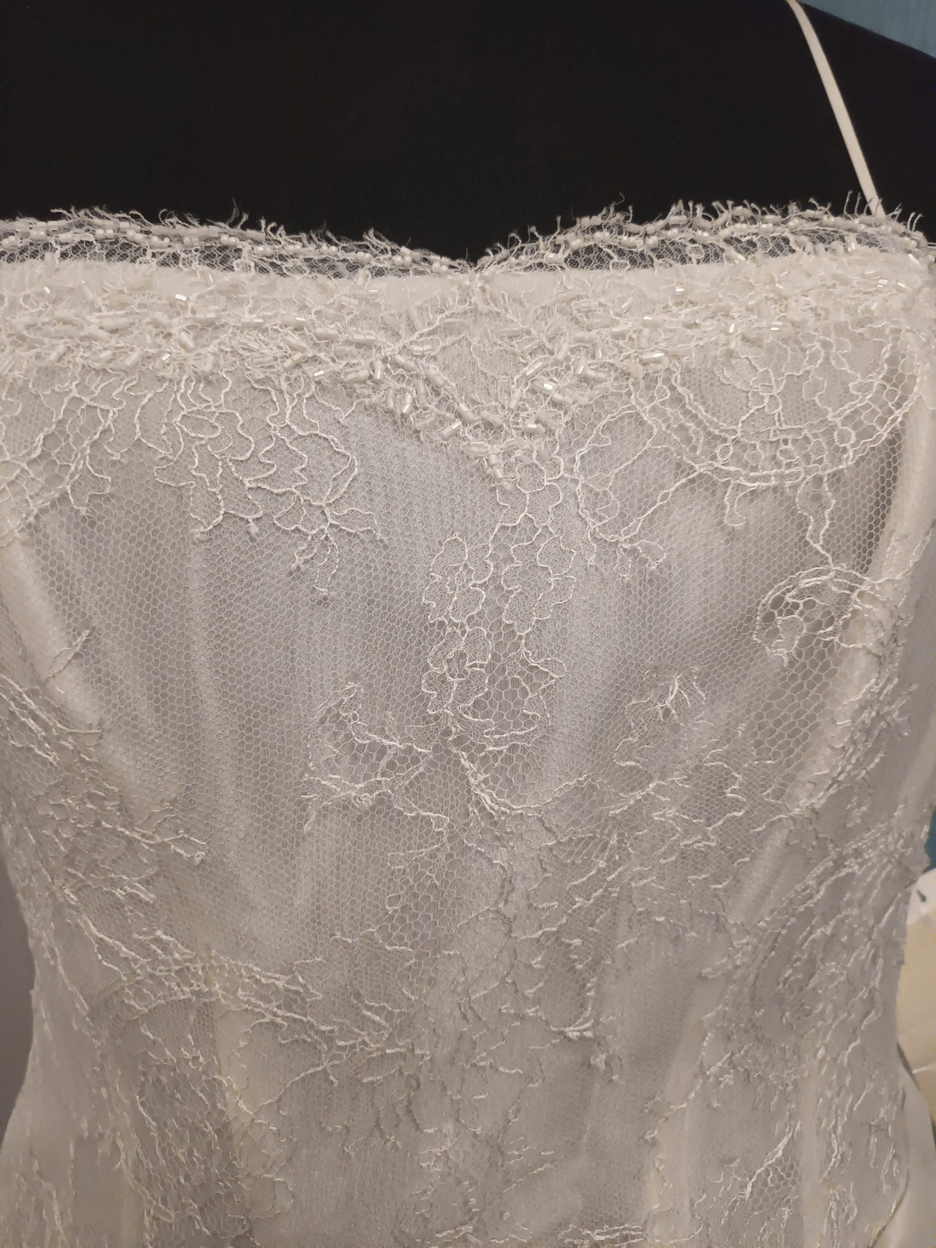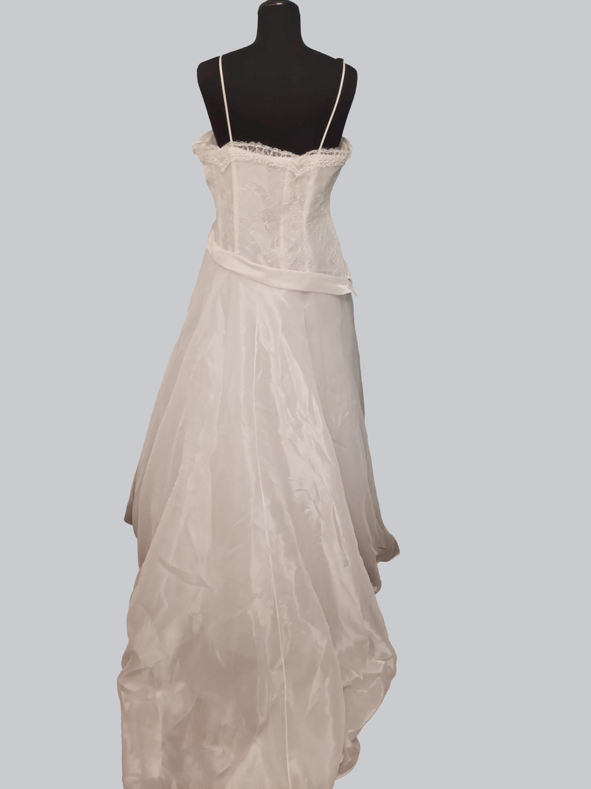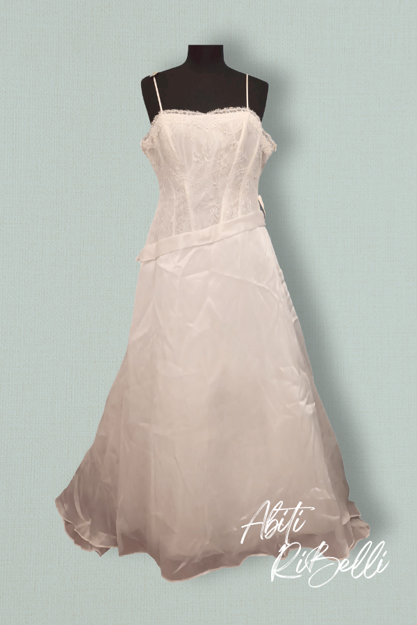 abito con corpetto asimmetrico in pizzo chantilly e gonna in organza