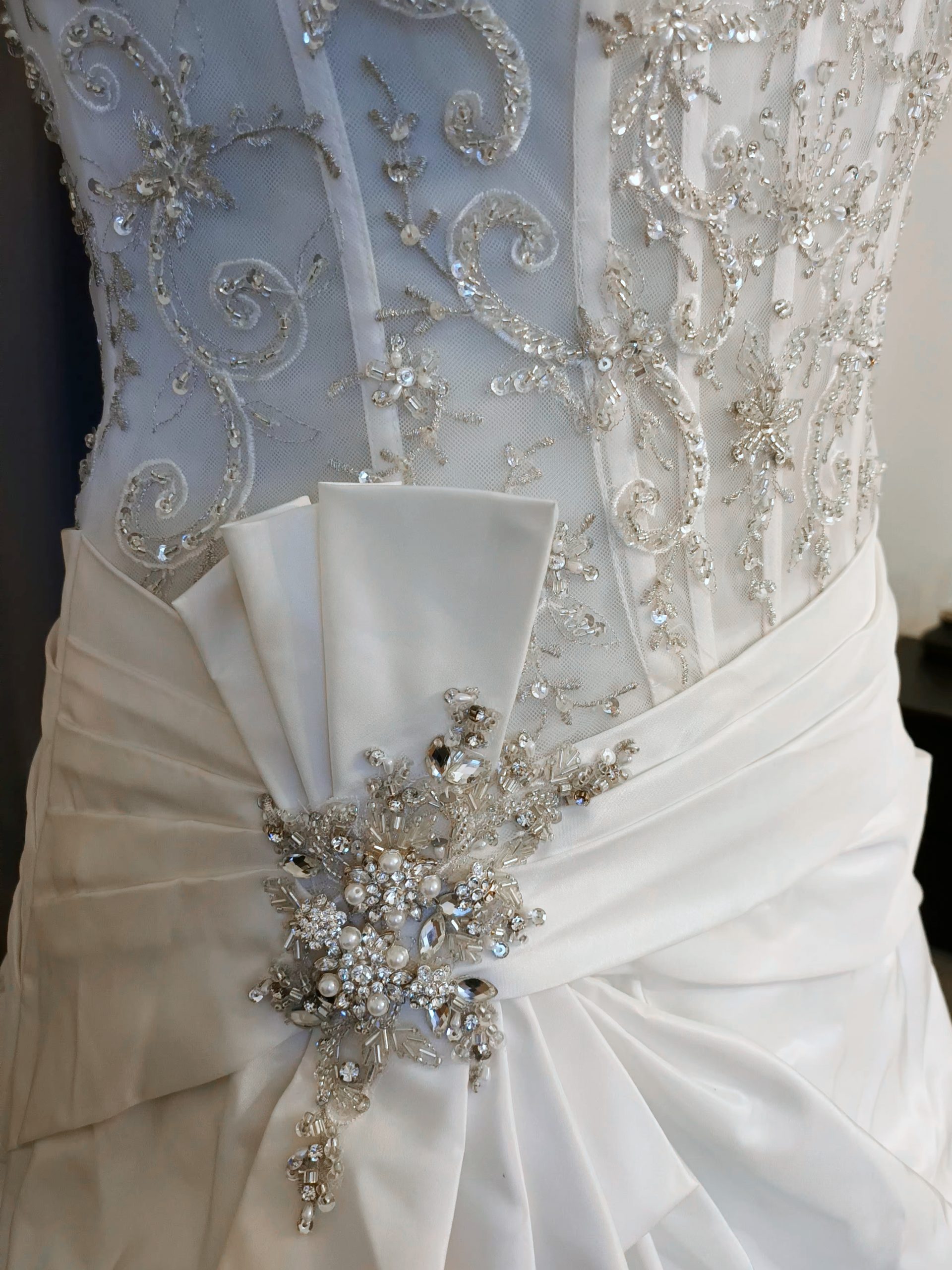 abito decoltè con bustier steccato con ricami bicolore e gonna in taffetà