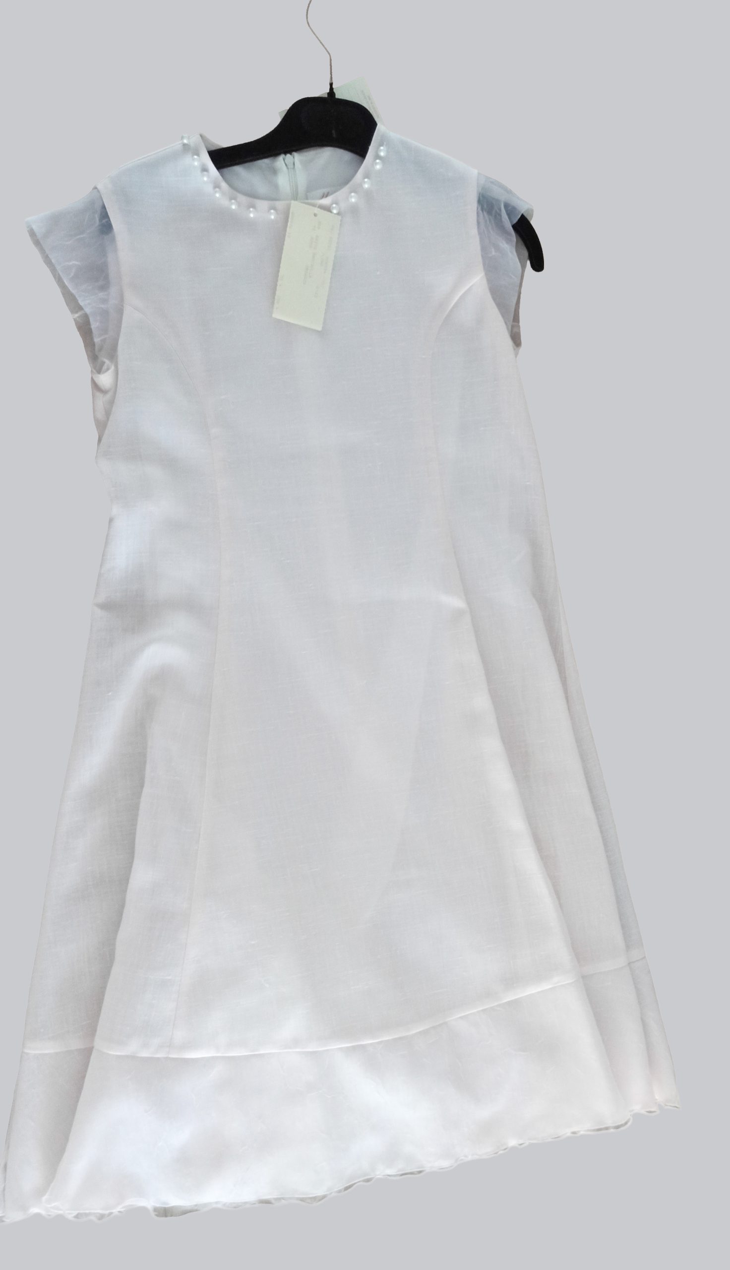 Abito damigella in lino color crema con manichette in organza e con perline girocollo